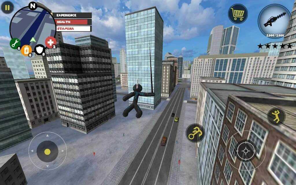 左侧移动、加速,右侧绳索,攻击(跳跃),跳跃,右上侧的武器更换以及血量、经验的显示都实时更新,一览无遗,凭借着大家自由的玩法,与其他帮派的人物进行交火,期间杀人能够获得经验,杀多了会产生星级,警察和其他附近角色会特殊照顾你对你展开火热的进攻,而如何存活,如何将其他人物击杀则是你所需要完成的任务。
