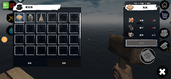 像是地基、木板、楼梯、柱子等,只需一把创造锤,就能解决所有建造相关问题。当鲨鱼攻击地基时,要立刻用木质矛反击。一方面,事后修补相较于建造木筏,能减少更多资源消耗;另一方面,鲨鱼受到一定程度攻击后就会死亡,在其尸体消失前的这段时间,可在周边安全地搜刮资源,当然,也别忘记鲨鱼肉还能食用。