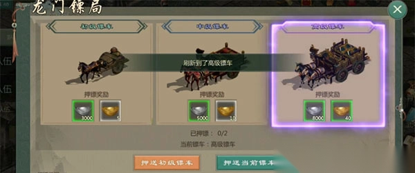 如果说对于镖车的等级不是很满意的话,可以进行刷新操作,每日有三次的免费刷新机会,消耗玩之后就要使用元宝来进行操作了。对于镖车满意的话,直接点击界面中的押送当前镖车就行了。