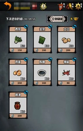 ③做菜:于华山菜贩子处采购食材,接着在灶台处进行烹饪。当前知晓的菜品配方有炒青菜、韭菜炒鸡蛋、酸辣土豆丝。完成烹饪后,将菜品拿到当铺售卖,总计可获利1万(例如:青菜每个150,炒青菜成本600,售价800 )。