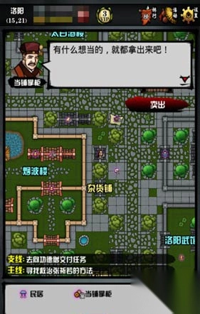 2、郭芙对话找马(襄阳2,25),襄阳(3,4),华山(17,0),洛阳(34,22),汉阳(19,14)。去洛阳杂货店买一个麻绳准备好。