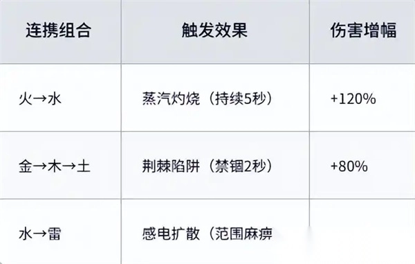 组建火+水+雷三角阵容,白尊者(火)起手→羽柔子(水)接续→宋书航(雷)收尾,可触发双重元素反应。