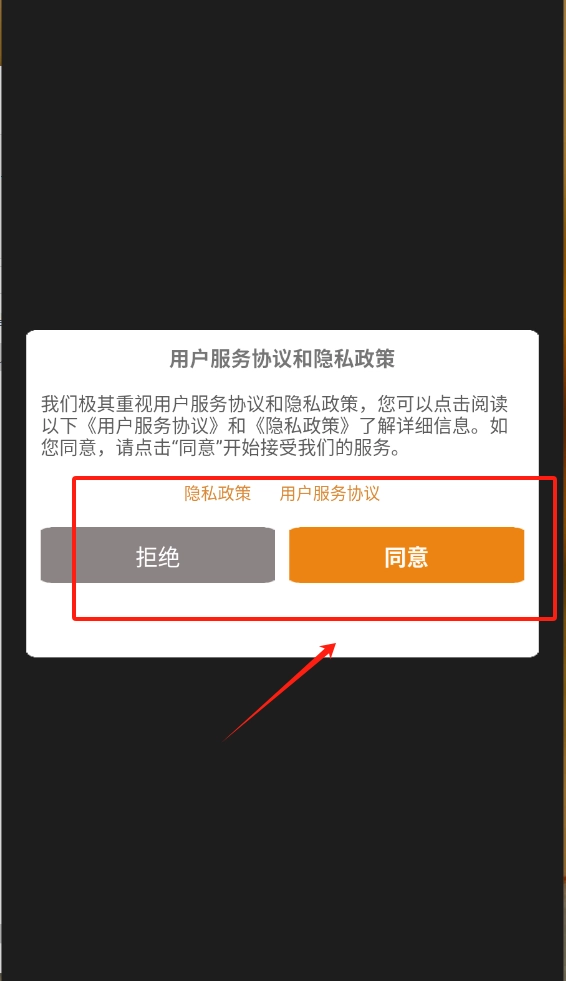 1. 界面呈现为黑色背景搭配白色边框,其上提示你阅读相关协议。若点击橙色的“同意”按钮,即可开启游戏;若点击灰色的“拒绝”按钮,则会退出程序。此外,还有链接可供查看具体条款内容。