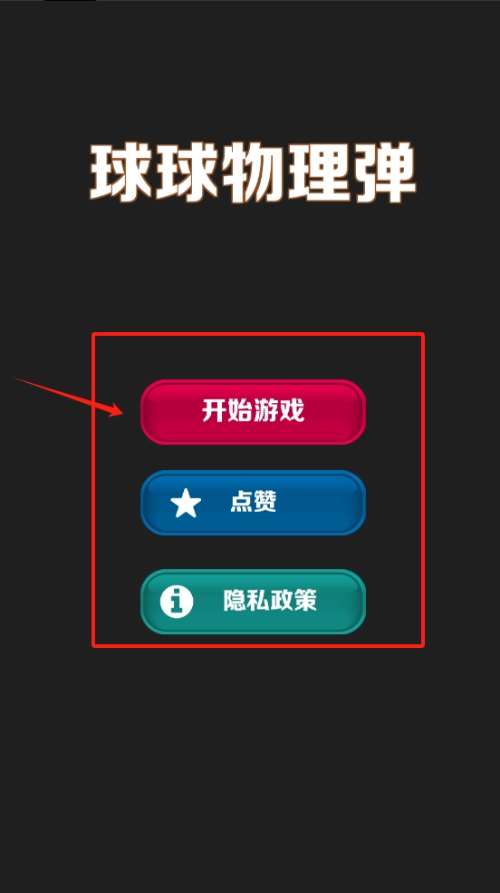 2、主界面有红、蓝、绿三个按钮。红色开始游戏,蓝色点赞,绿色点隐私政策可查看规则。