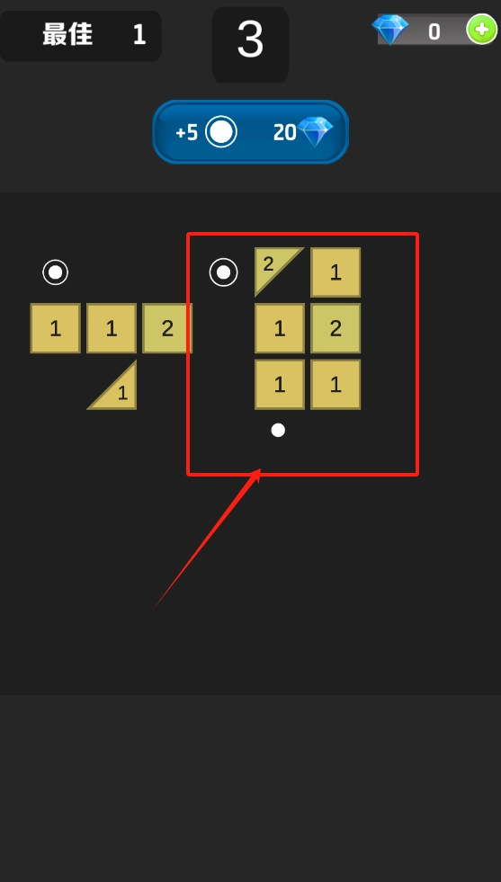 3、游戏界面顶部显示得分和钻石数,点击红色框内的方块矩阵消除得分,黄色方块数字代表分值,白点可能是道具提示。