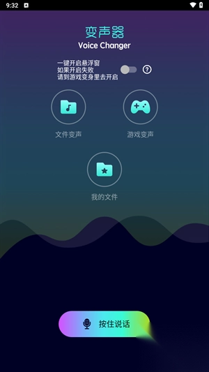 1、在开心电玩软件园进行这款软件的下载安装操作,打开之后,我们便能非常直观的看到软件主界面,在这里拥有文件变声、游戏变声、我的文件等一系列功能并且还可以一键开启悬浮窗。