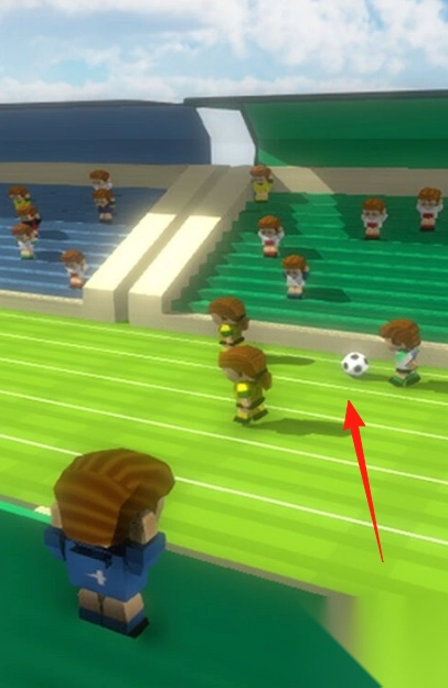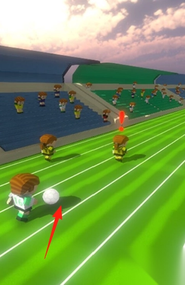 1. 场景设定于3D像素风格的球场,玩家操控身着黄、蓝、绿队服的方块人球员,与身着异色队服的对手展开足球争夺,努力射门得分。