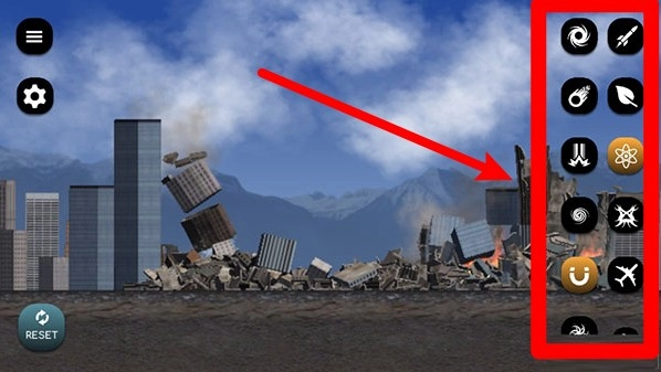 1.点击底部图标栏中的灾难按钮,可选择龙卷风、火山、海啸等自然灾害进行城市毁灭操作。