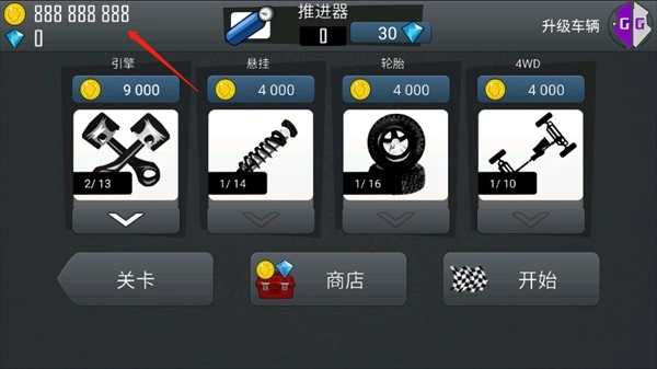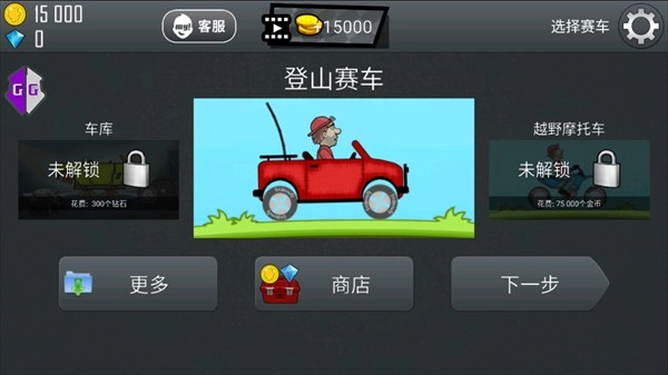 4、当进入《登山赛车》后,我们得通过闯关卡来赚取一定数量的金币,就像下图展示的那样,此刻拥有的金币数量为15000。