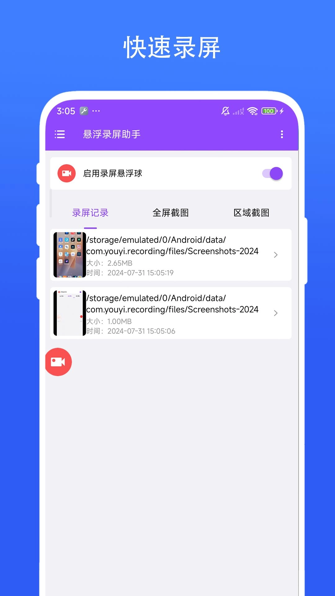 1、悬浮窗口一键启动录屏,无需切换界面操作即可快速开始或暂停录制。