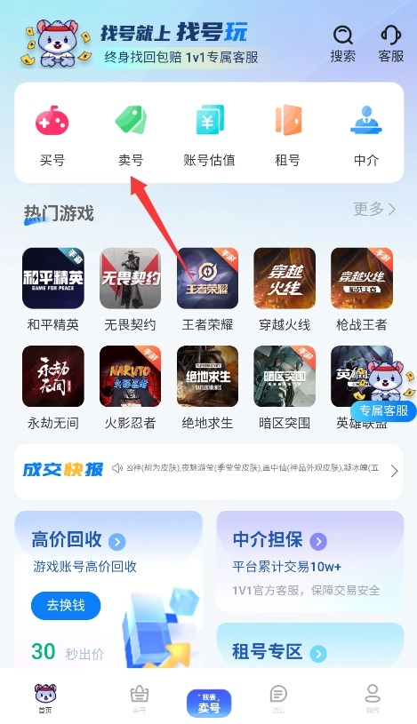 3、进入平台首页选择"卖号"功能,完善账号信息后点击发布功能即可上架出售。