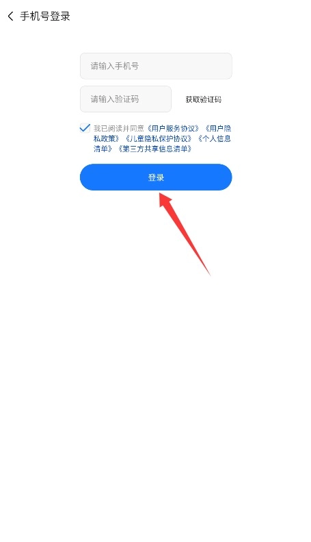 2、输入手机号码获取短信验证码,填写验证信息并勾选协议后完成账号登录。