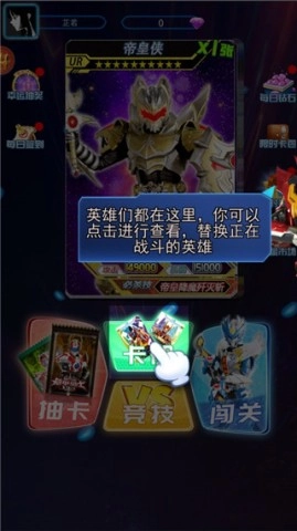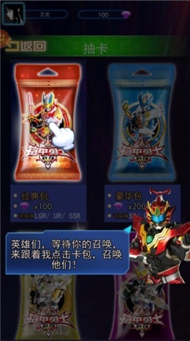1、下载铠甲勇士拆包对战类游戏,进入游戏后,能够召唤出各个铠甲英雄,通过点击卡包来实现召唤操作。