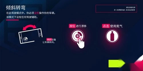 通过倾斜设备来控制车辆方向,按住屏幕为漂移,点击屏幕为使用氮气。