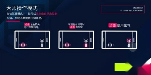 在此模式下,玩家需点击左右箭头进行转弯,点击刹车进行减速,并点击使用氮气加速。