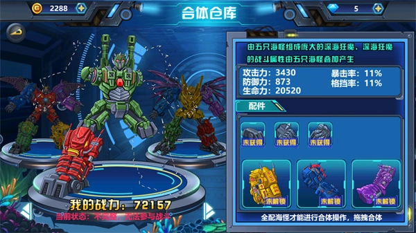1. 进入游戏后,主界面设有机甲仓库、合体仓库、竞技场、合体战争等多种模式玩法。