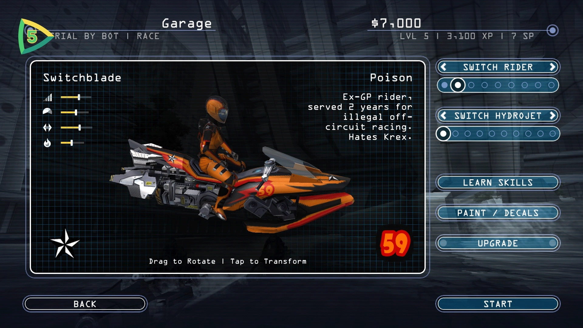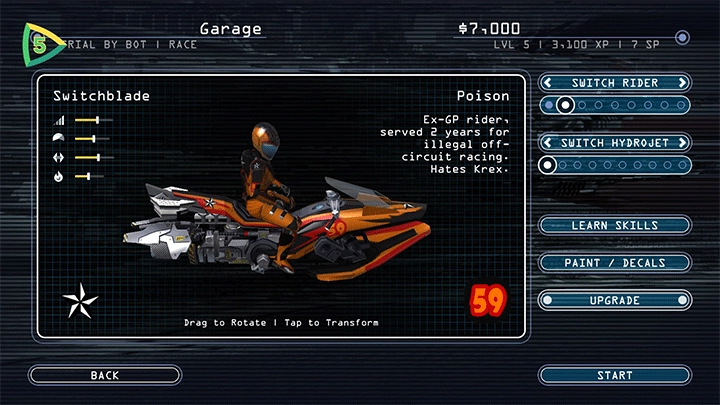 • 深度职业模式 - 于各类比赛与 Boss 战里全力以赴,一路奋进,最终登顶地下水力喷射赛车赛道。在此过程中,赢取现金与经验值,用于升级及定制您的水力喷射赛车,解锁全新特技,同时提升骑手的表现。