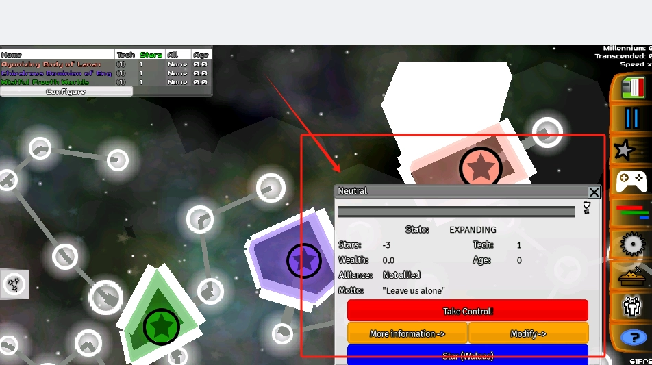 2、看右边红框里的Take Control按钮,点它就能占领这个中立星球。