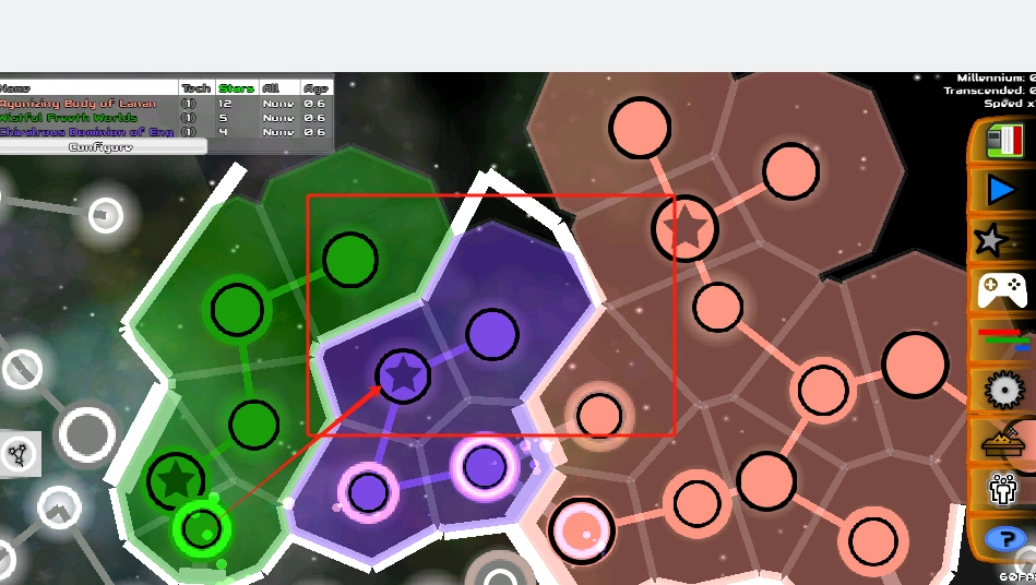 3、注意不同颜色的六边形区域,绿色是你的地盘,点它们能管理星球。