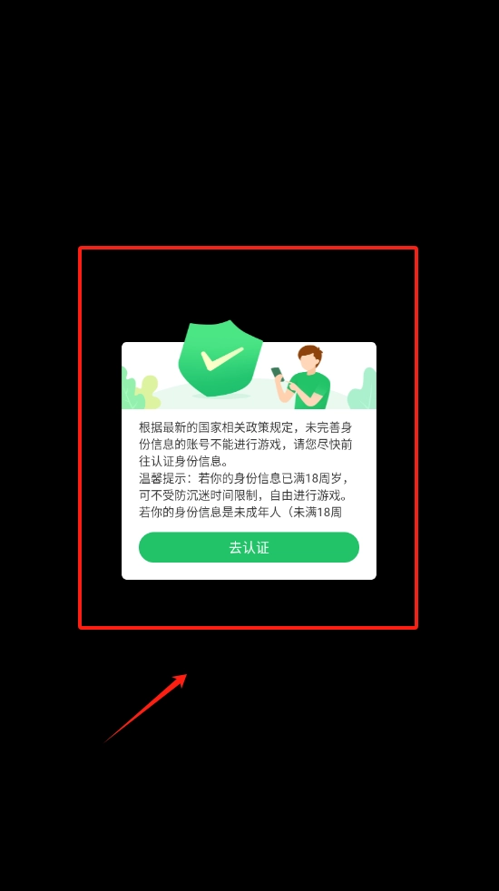 1. 此为身份认证界面,黑色的背景上有红色边框。界面顶部的绿色盾牌与小人,起到提示认证的作用。下方文字表明,年满18岁即可免除防沉迷限制,点击绿色按钮便可进行认证。