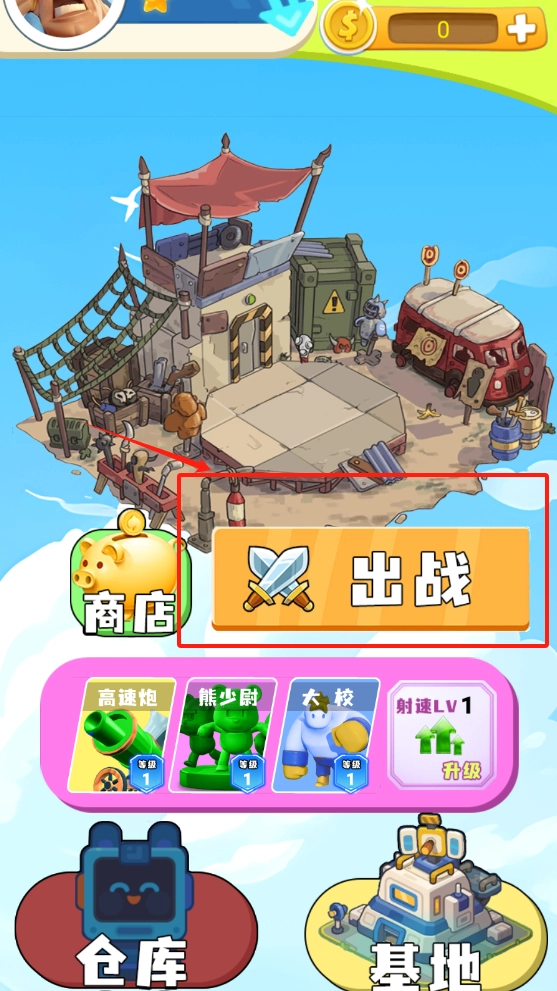 3、游戏的主界面呈现的是野外营地场景,在界面下方,从左至右排列着的功能按钮分别为:商店按钮、出战按钮、带有升级选项的三个角色/道具按钮、仓库按钮以及基地按钮。