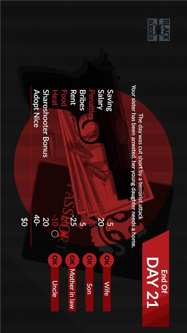 《黑色边境》是一款跨界游戏,它模拟了真实边境巡逻人员的生活。在这款游戏里,你扮演过境口岸及出入境口岸的警察,需要检查乘客证件,制止走私非法物品及贿赂行为。