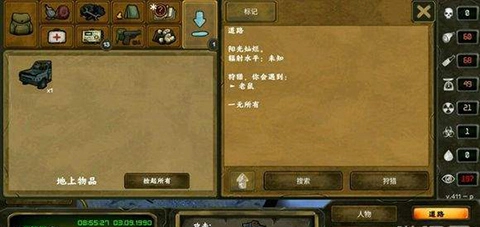 第二个地点在城市,城里存在辐射。千万别在城市内睡觉,辐射强度过高会导致中毒,而且前期解毒药数量稀少。在城市进行搜刮后,能获取以下物品。
