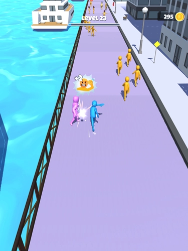1. 操控蓝色人物在赛道上奔跑,能够消耗金币来使用道具增强能力,收集沿途的金币,并与黄色等其他颜色的人物进行互动。