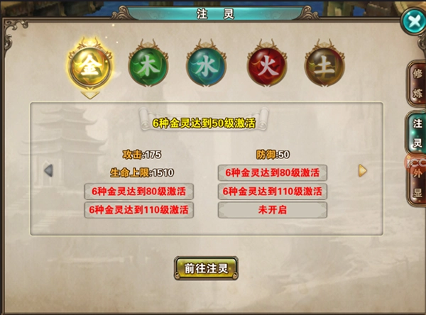 每个五行之灵下均设有6个对应的子灵。通过注灵提升子灵等级,能够获取五行属性的增强。当6个子灵的等级满足特定等级条件时,还可激活五行之灵的额外属性。在五行之灵界面,点击左右翻页,即可查看可激活的额外属性及其所需条件。