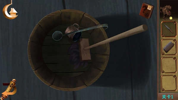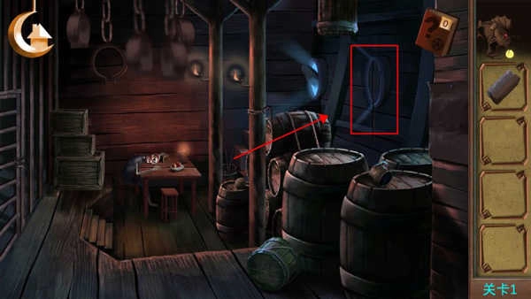 第一步,点击骷髅,获取匕首;接着点击水桶,拿到刷子;随后用匕首割下柱子上的绳子;再点击窗户,得到骨头;之后用刷子刷去右墙上纸张的污渍,从而获得提示;然后点击桌子上的盒子,输入密码V、I、VII,打开盒子拿到哨子;使用哨子叫醒狗,再用骨头召唤它,得到钥匙后,即可开门逃离。
