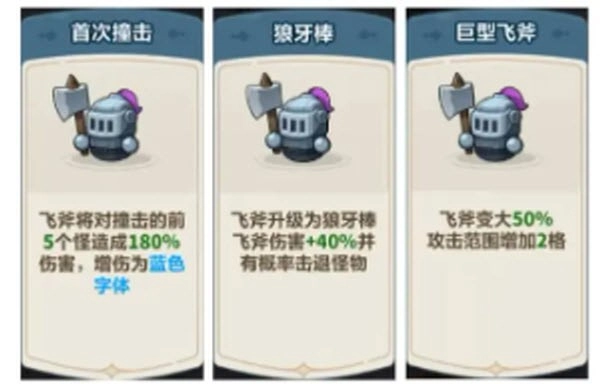 “飞斧”和“三板斧”具备范围伤害以及击退功效,能够有效地阻拦怪物靠近城墙。