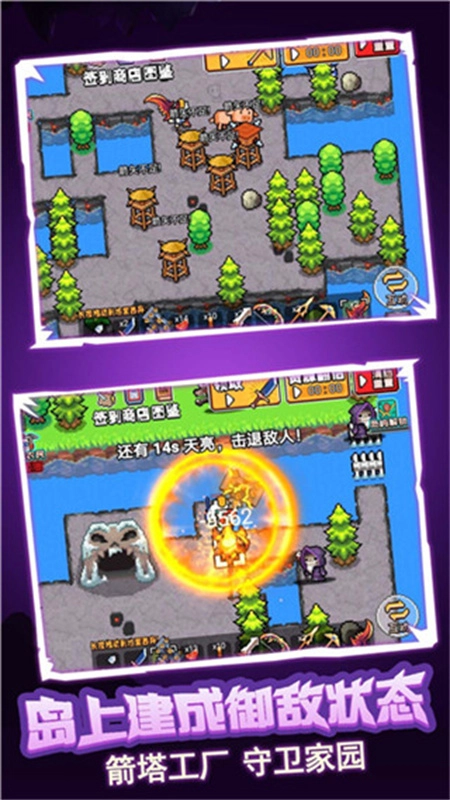 每当游戏进入黑夜时段,便会涌现出大量怪物。玩家需提前准备好箭塔等防守武器,守护好物资,以顺利熬过黑夜。