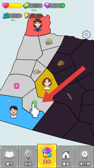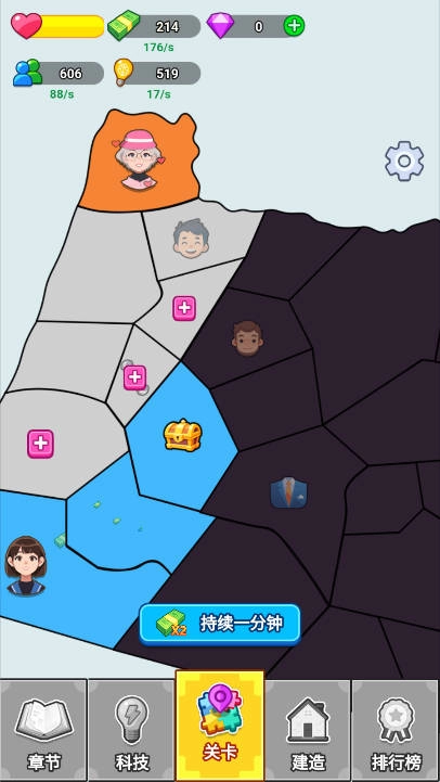 1. 游戏底部设有章节、科技、关卡、建造、排行榜等功能按钮,具备资源管理、关卡挑战、建造升级等玩法。