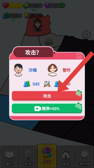 3、展示带有攻击性质的标题,设有攻击按钮,还有概率增加50%且可通过看广告提升的选项。页面底部存在章节、科技等功能按钮,同时呈现战斗决策环节。