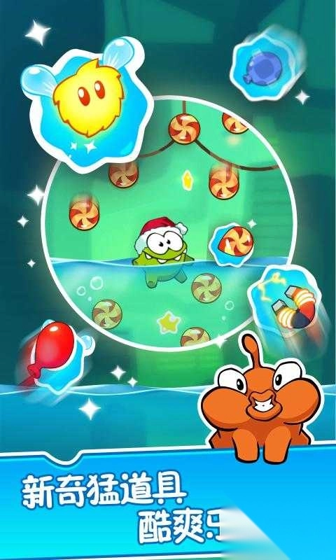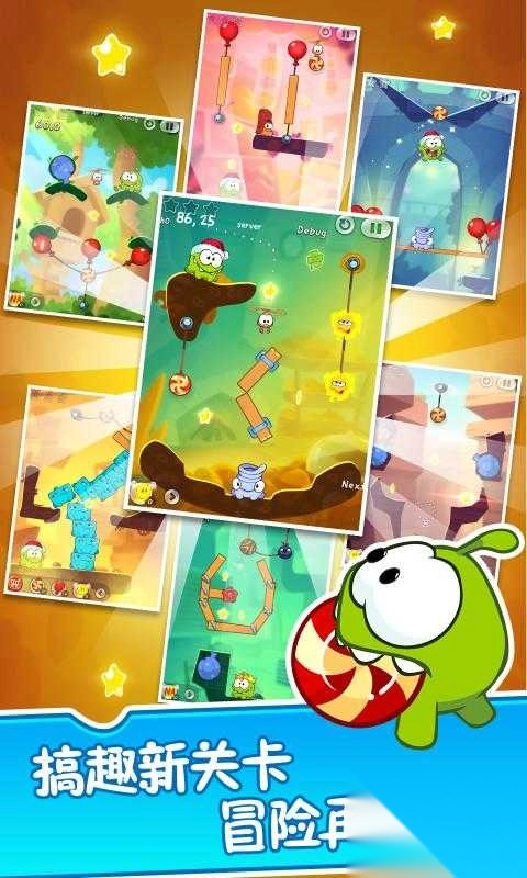 在第一个章节的初始关卡里,通过手指滑动的方式切断悬挂糖果的绳子,使糖果自然掉落,同时收集途中的星星,最终将糖果投喂给那只绿色的小怪兽Om Nom。