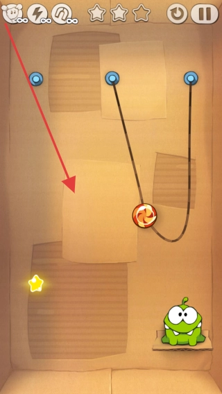 在第二个小关卡中,仔细留意绳索的排列方式,把靠左边的那根绳索切断,这样糖果就会顺着预设的路径滑动,途中收集到星星后,最终会进入怪兽的嘴里。