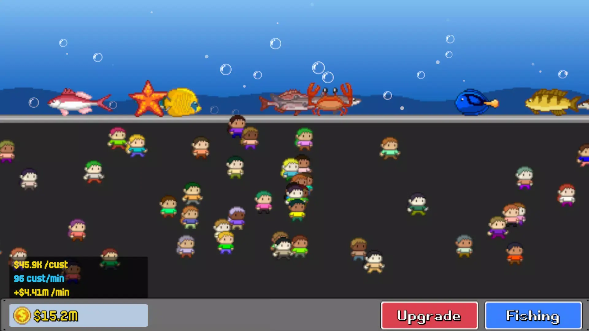 玩家能够通过点击屏幕来操控角色进行潜水,并且利用鱼竿捕获鱼类。