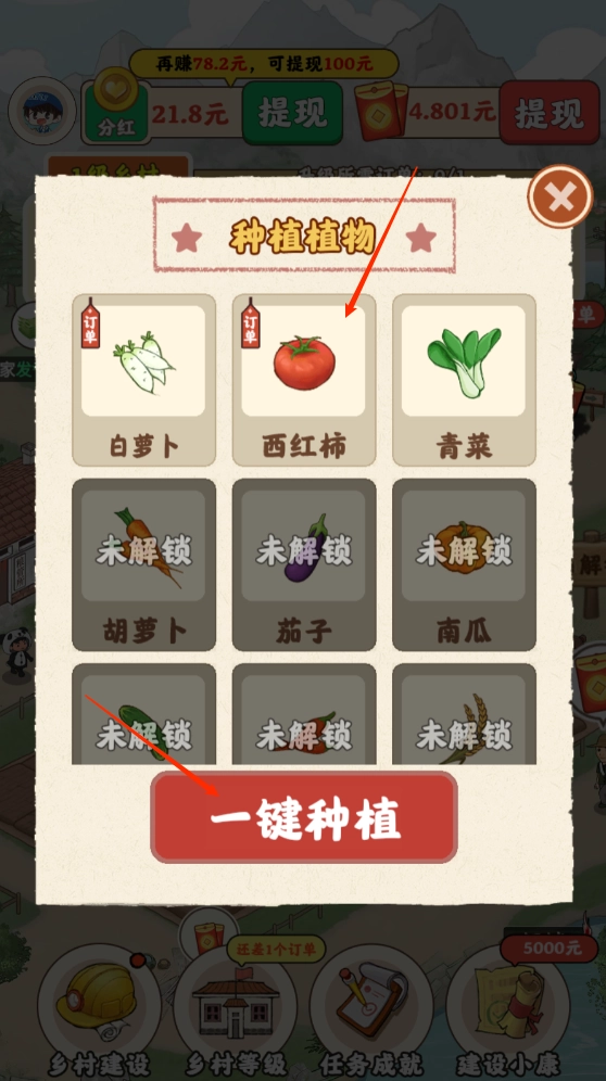 种植界面会把目标种子标记出来,点击就能进行种植,也可以直接选择一键种植功能。