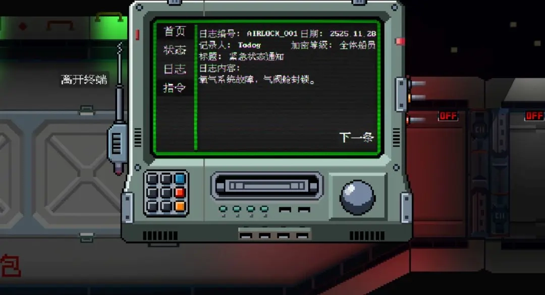 角色存在氧气限制机制,一旦氧气耗尽就会死亡并导致游戏结束,氧气通常能维持约10分钟,玩家可借助氧气瓶延长生存时间。太空站场景的空间范围较为有限,但营造出的氛围感十分出色。谜题的关键线索隐藏在小纸条之中,玩家可以通过收集到的书籍来查看所有小纸条的具体信息。大部分门禁需要输入特定指令才能开启,而当全部门禁被开启后,可能会遭遇一些生物的攻击。