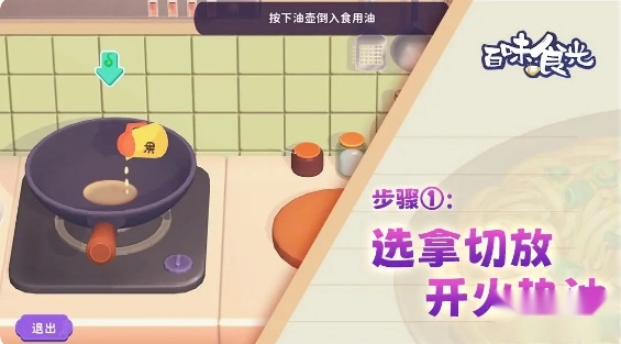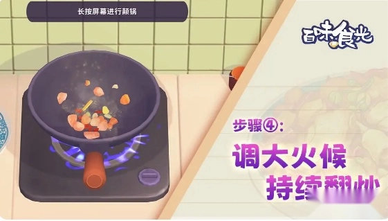 接下来就可以着手放入食材了,取过方才切好的食材放进锅中,点击屏幕拿起炒锅,长按屏幕颠锅来对锅里的菜进行加热。
