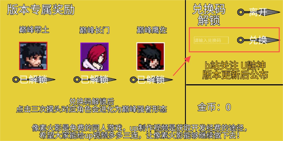 在【兑换码解锁】板块下方的输入框内填写“虫虫助手巅峰降临”,完成输入后点击兑换按钮,就能解锁巅峰带土、巅峰长门与巅峰鹰佐这三个角色。