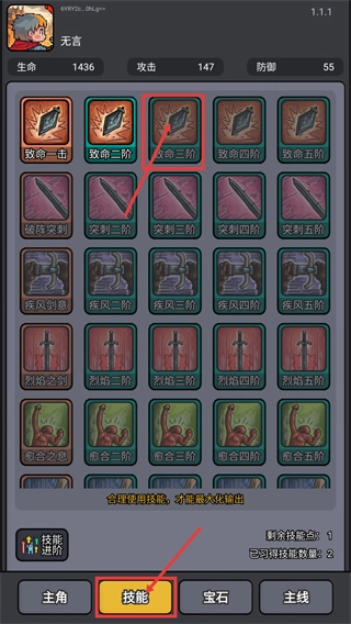 在关卡战斗时,当敌方显示【1136-血量】这一状态,便可释放【致命一击】技能,同时通过【愈合一阶】来恢复自身血量,以此保持战斗状态。