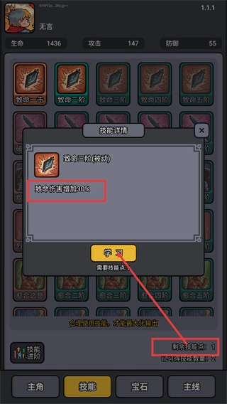 点击【致命三阶(被动)】后,消耗【1减去剩余技能点】来学习该技能,能够获得【致命伤害提升30%】的增益效果。