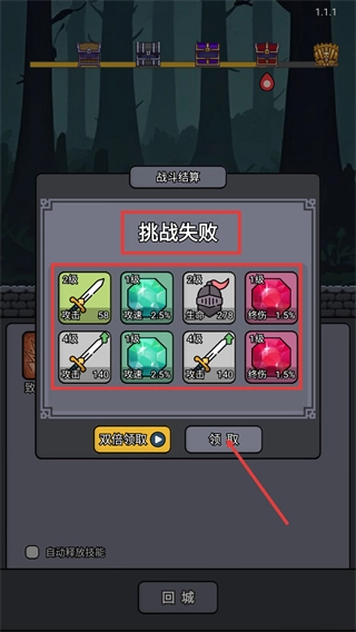 在【挑战失败】后点击【领取】按钮,能够获取【2级-攻击-58】装备、【1级-攻速-2.5%】宝石之类的资源,这些资源可用来强化角色的属性。