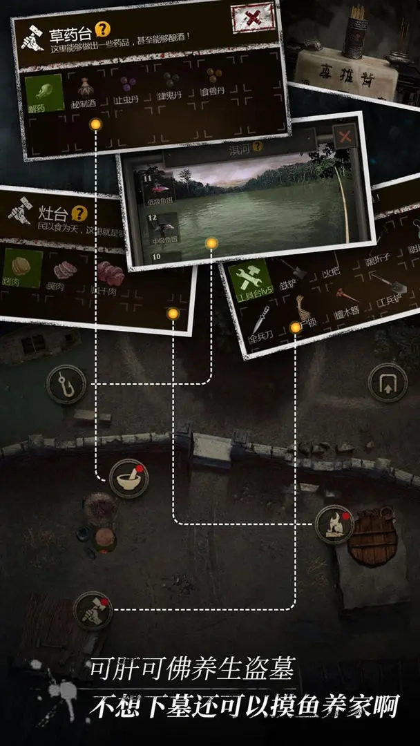 《盗墓长生印》这款游戏,并非单一的探险类型,而是巧妙地将放置、盗墓、解谜、经营与战斗等多种玩法元素融合其中。玩家既能深入墓内,在充满未知的环境中展开探险,通过智慧解开各类谜题,时刻警惕并避开危险的陷阱;又需在墓外打理工具台、仓库、灶台、草药台等一系列设施,进行经营管理。此外,墓外的钓鱼系统也不容小觑,它是重要的补给途径,玩家不仅能钓到可供使用的鱼类,还能从中获取生存所需的各类必要资源。