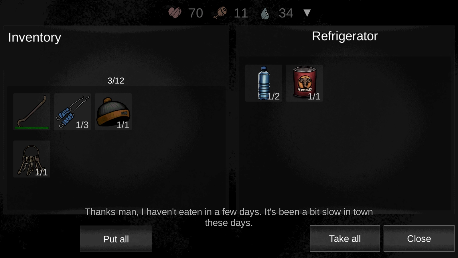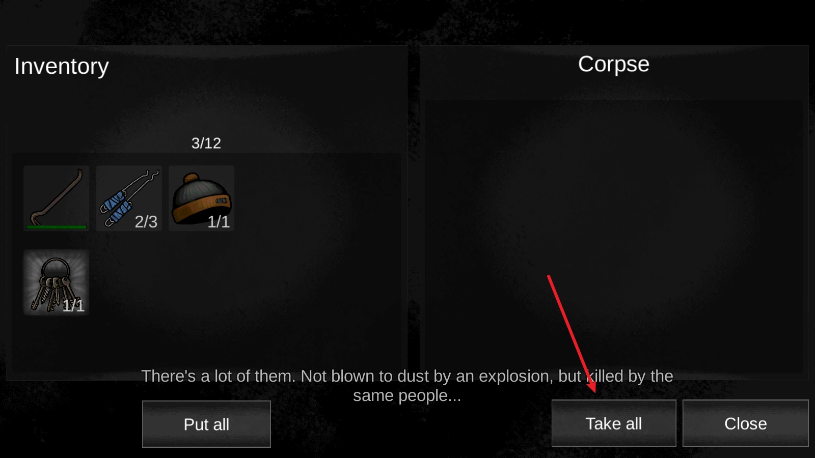 我们能够在场景里到处收集资源,靠近后点击就能打开背包,点击TAKE ALL就能把所有资源都放进背包。