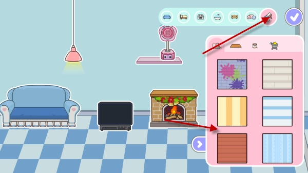 点击右上角的粉刷界面,在这里可以为墙壁和地面换上喜欢的类型。
