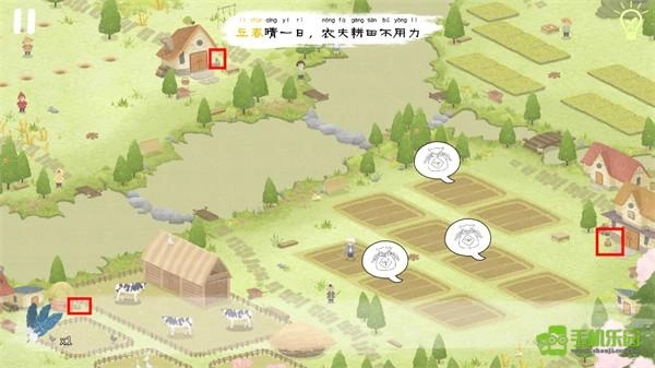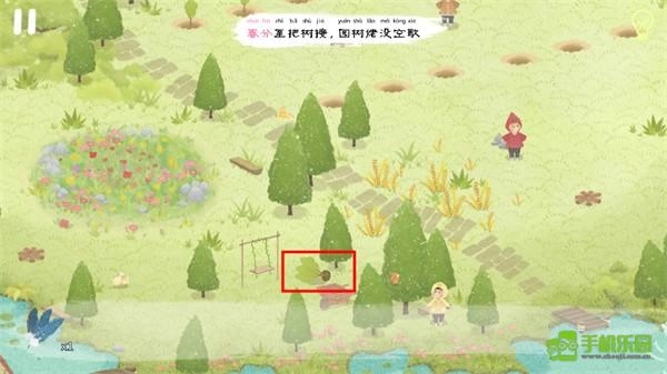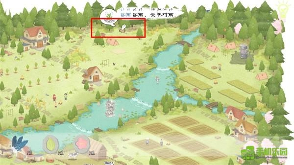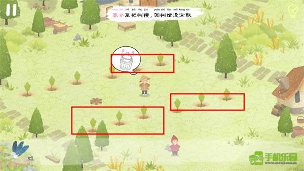 接下来我们要协助左上方的农民伯伯栽种树木,在场景里的三个不同位置能找到小树苗(具体位置可参照下图)。当获取到“树苗”后,把它拖动到农民伯伯身旁的三个红框下方进行种植。
