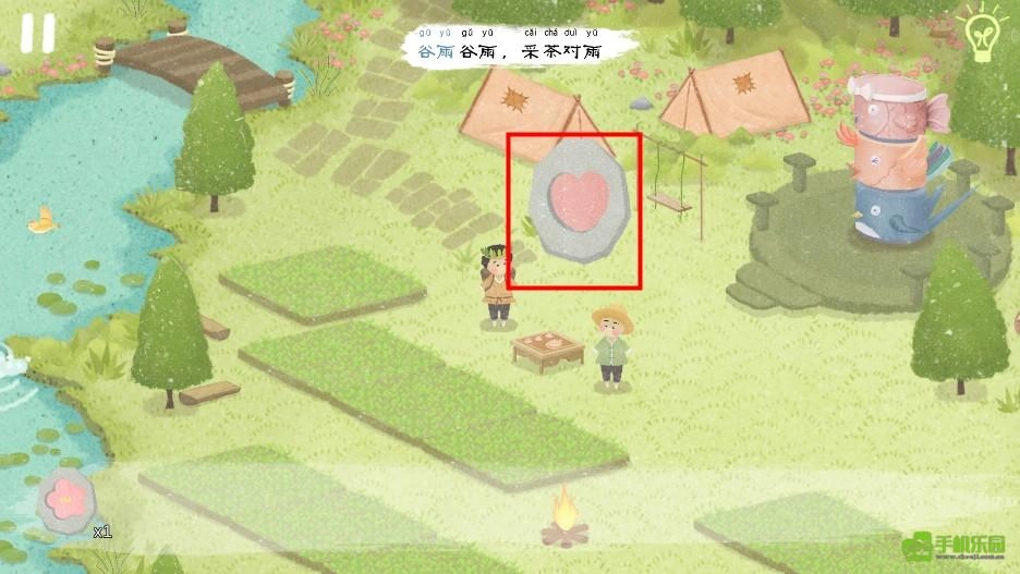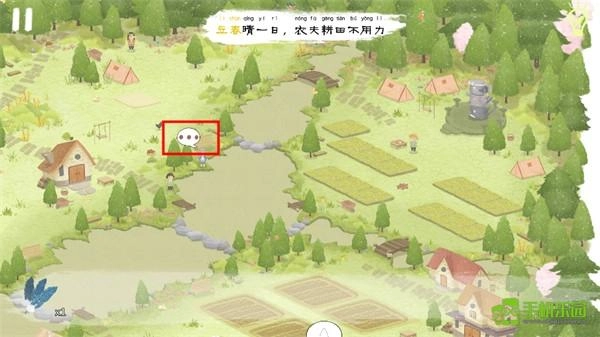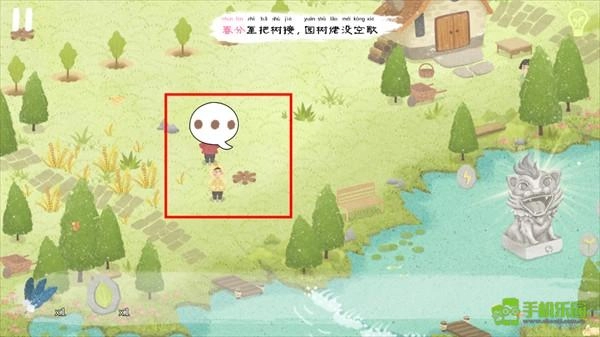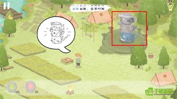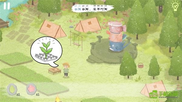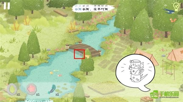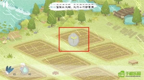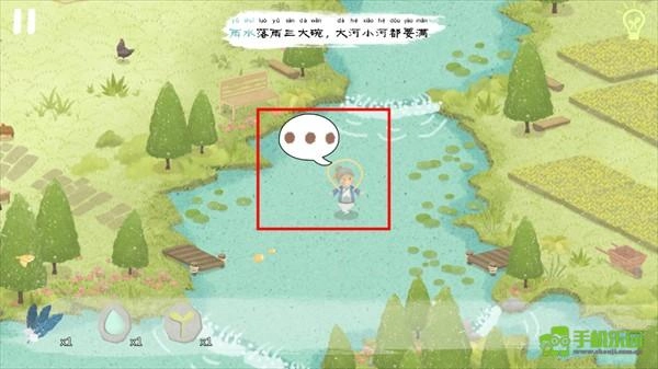当所有河流都注满水后,河边的老婆婆激动地跳进了河中,点击婆婆身旁就能得到“水滴石板”;大雨滂沱时,在田地上空也能获取嫩芽石板。