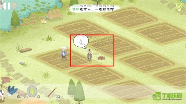 右侧的农民大叔在寻找头上绑着叶子的人,点击红框里的采茶女,她会误吃毒草后倒下,之后再点击采茶女,就会提示玩家去茶园摘些茶叶带过来。